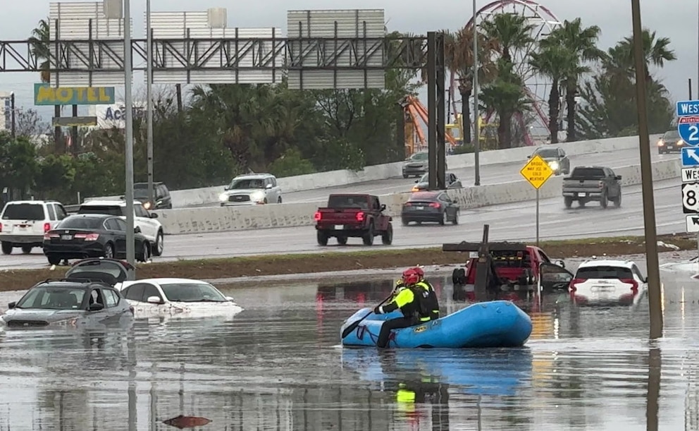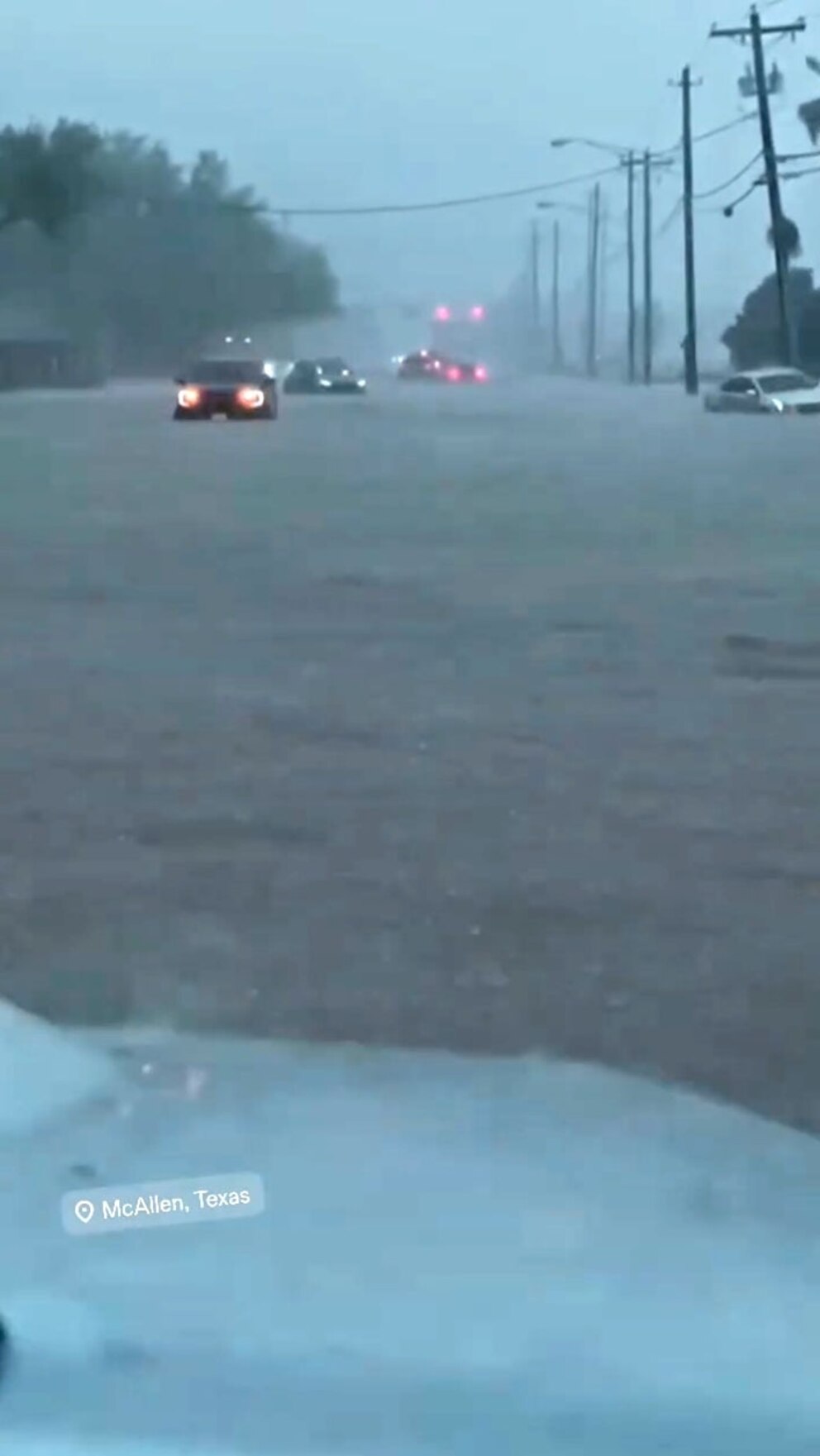 Video shows first responders in inflatable boats rescuing people stranded on roadways. The South Texas Health System hospital in McAllen experienced minor flooding on its first floor.