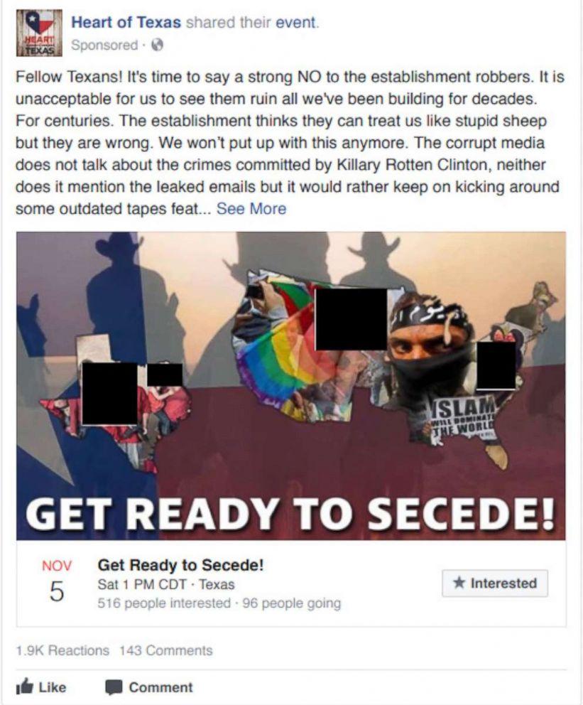 Burr identified fake groups created in Texas -- one supporting Texas secession and another called "United Muslims of America" -- that created conflicting events at an Islamic center in Houston, with the goal of bringing conflicting groups together to foment unrest.