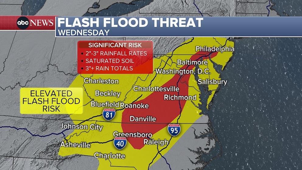 Major I-95 cities -- Philadelphia, Baltimore, Washington, D.C., and Richmond, Virginia -- could be impacted as heavy downpours could bring 2-3 inches of rainfall per hour over already saturated soils, which could easily cause flash flooding.