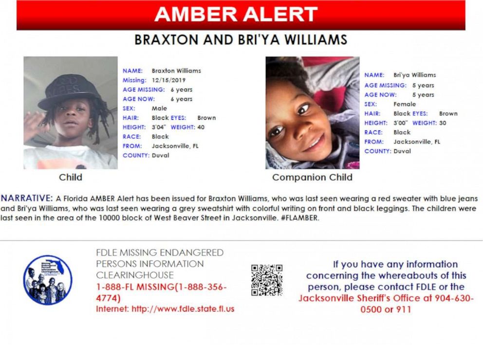 Braxton Williams, 6, and his sister Bri'ya Williams, 5, were last seen playing in front of their residence in Jacksonville's Paradise Village mobile home community on Sunday morning. Family members searched for the children before reporting them missing that afternoon, according to the Jacksonville Sheriff's Office.