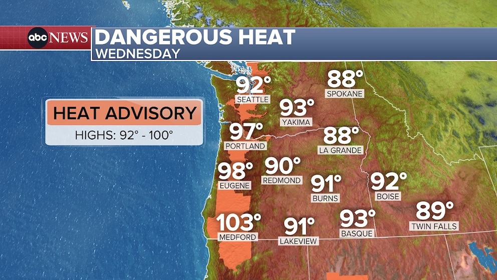 In the West, a heat advisory is in place from Northern California to northern Washington with temperatures 10 to 15 degrees above average. Portland, Oregon, could near 100 degrees on Wednesday and Seattle could reach the 90s.