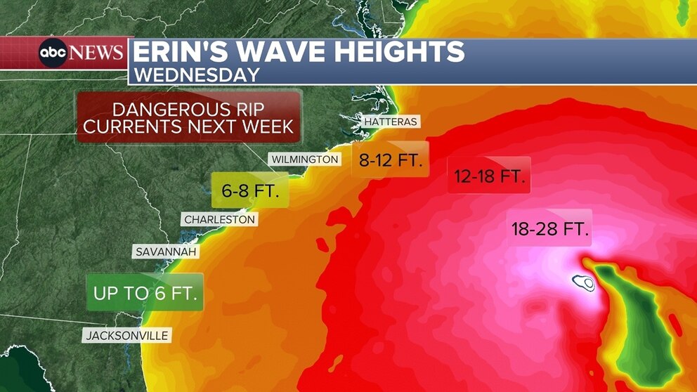 This would not only be dangerous for anyone entering the waters, but also for property along the coast, as erosion -- especially along North Carolina's Outer Banks -- could be a serious threat. The Outer Banks and other parts of North Carolina could see waves of 8 to 12 feet, with other areas of South Carolina and Virginia possibly seeing waves reaching 6 feet next week.