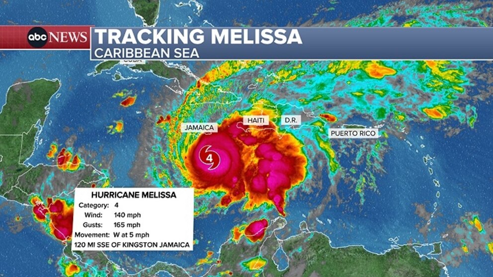 As of Sunday evening, Melissa was located about 115 miles south of Kingston, Jamaica, moving toward the west at 5 mph and remained a major Category 4 storm, producing maximum sustained wind speeds of 145 mph.