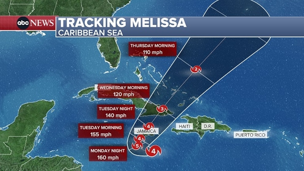 Melissa was forecast to strengthen to a major Category 5 hurricane by Monday, packing maximum sustained wind speeds of 160 mph. Some fluctuations in intensity are possible before the storm makes landfall. At the very least, it is expected to remain a strong Category 4 storm as it moves over Jamaica on Tuesday.