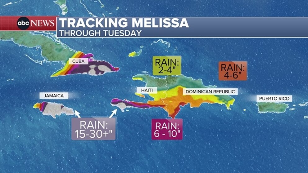 Once it moves across Jamaica, Melissa is expected to continue north, then northeast on Tuesday and into Wednesday. It will likely make landfall a second time over eastern Cuba late Tuesday night or early Wednesday morning, and could make landfall a third time as it moves near or over the southeastern Bahamas and Turks and Caicos.