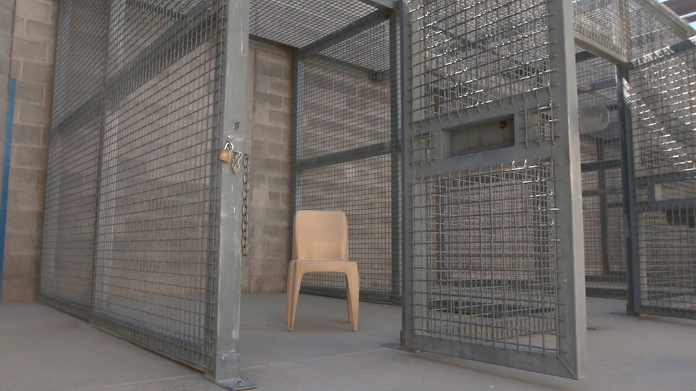 The most restrictive common area has metal chairs and tables bolted to the floor with enclosures that look like cages for inmates to have video calls. Metal and cement enclosures are also scattered around the outdoor recreation area to be used as needed.