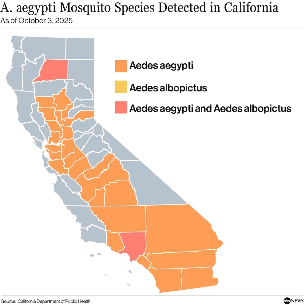 The species was first detected in California in 2013 and has been detected throughout 27 counties since -- especially in Southern California and the Central Valley, according to the California Department of Public Health. Earlier this month, Los Angeles County reported its first case of locally acquired dengue for the 2025 mosquito season -- with A. aegypti the likely culprit, Kelly said.