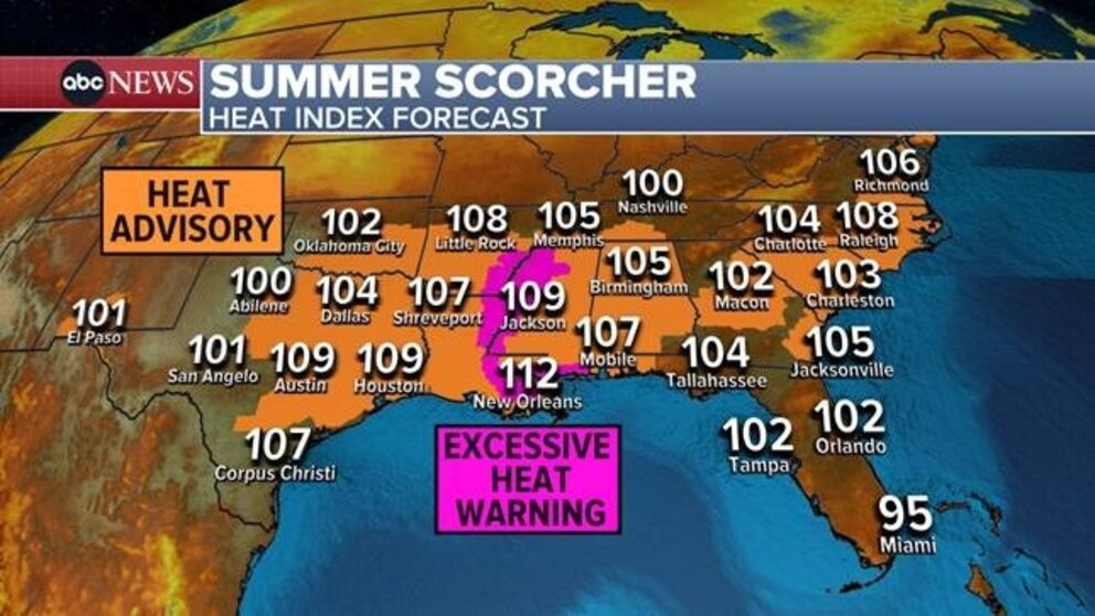 Heat advisories are in effect for much of the East Coast, as well. In the Carolinas, the heat index will make it feel like 110 on Sunday, while Virginia will feel like 108, and in Philadelphia and central New Jersey, the heat index will be around 103 on Sunday.