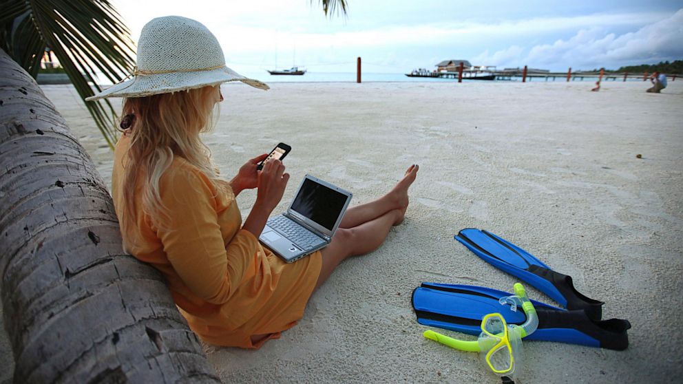 A woman sits on Villingili beach, working with a notebook and mobile phone.