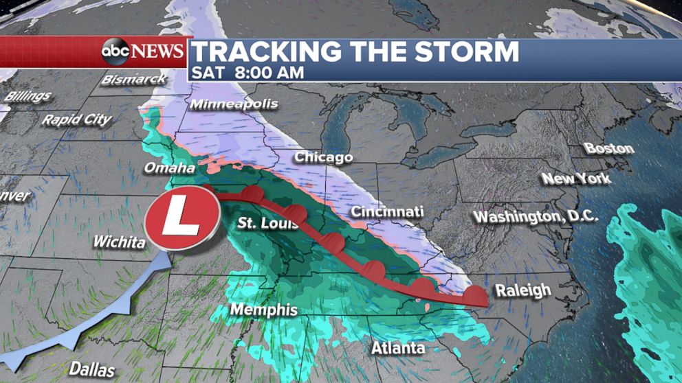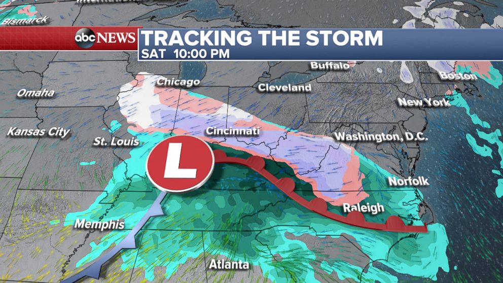 Saturday night the storm tracks across the Ohio Valley and into the mid-Atlantic with snow from Cincinnati to Roanoke, Virginia, before it moves off the coast early Sunday morning.