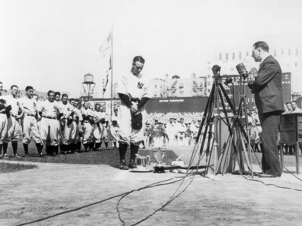 Lou Gehrig, first baseman for the New York Yankees, is shown at the microphone during Lou Gehrig Appreciation Day, a farewell to the slugger, at Yankee Stadium, July 4, 1939.