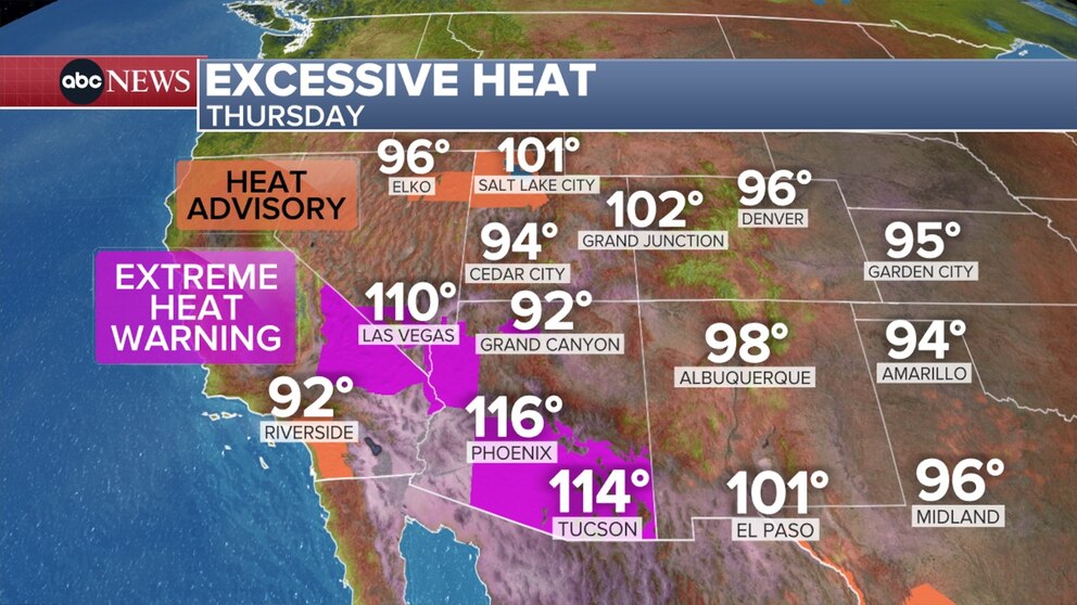 Out West, extreme heat warnings are in place for Thursday and Friday from Phoenix to Las Vegas, where temperatures could soar to 115 over the region.