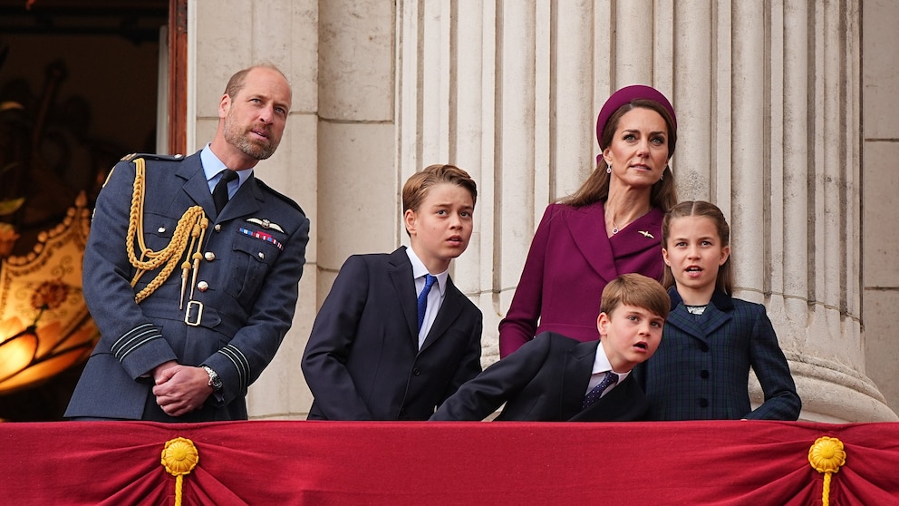 Prince William, Prince George, Prince Louis, the Princess of Wales, and Princess Charlotte on the balcony of Buckingham Palace during events marking the 80th anniversary of VE Day, May 5, 2025, in London.