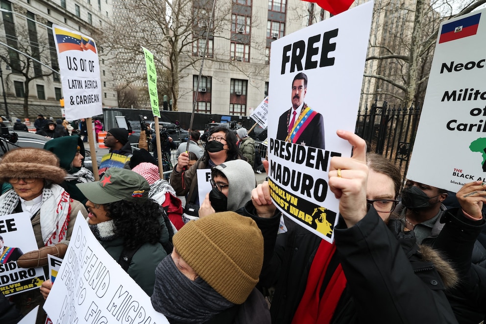 Before Monday's hearing, dueling groups of protesters gathered across the street from the courthouse, One group held signs urging President Donald Trump to "Free President Maduro," and the other supported of his capture.