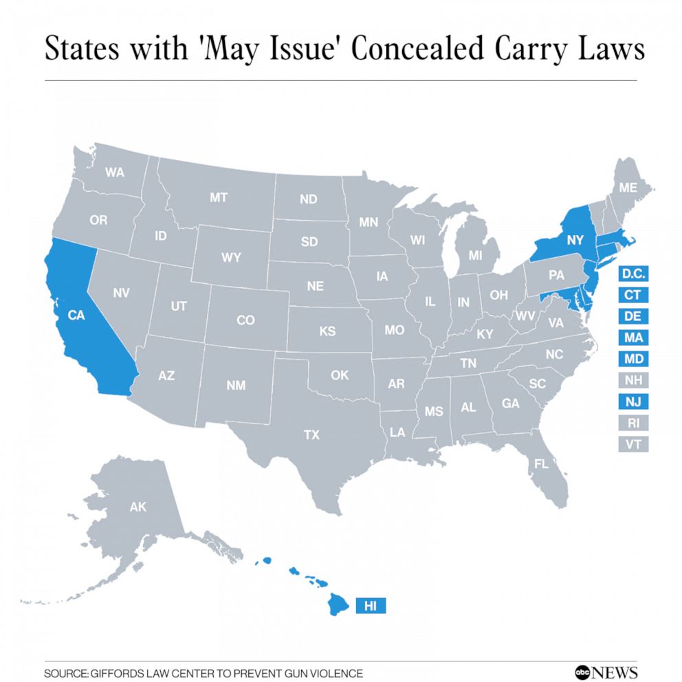 Among those, New York is one of eight states, as well as the District of Columbia, that have such "may issue" concealed carry laws. Someone may be denied a permit if, for instance, they have not demonstrated a strong reason to carry a weapon in public.