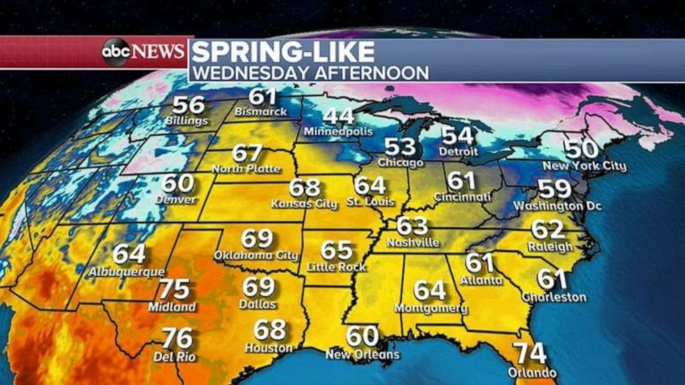 In the Northeast and for most of the country it will feel like spring today with temperatures near 60 in Denver, near 70 in Kansas City, in the 50s for Chicago and new York City and near 60 in Washington, D.C.