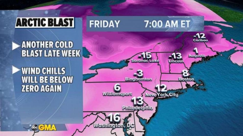 The cold air will return to the Northeast by Thursday night and into Friday with wind chills once again dropping below zero in upstate New York and New England.