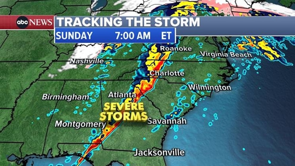 Residents were urged to pay attention to severe weather warnings as the tornado risk continued into Sunday for parts of Georgia. Warnings could be extended east to the Atlantic coastline as the storms progress.