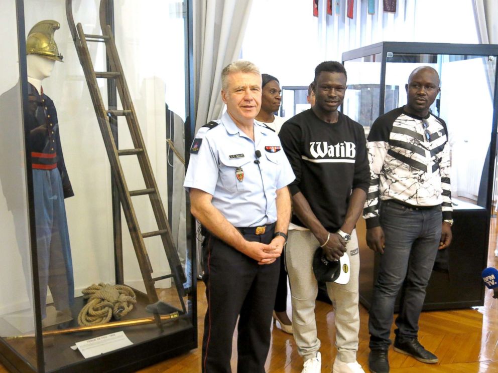 Paris -- The 22-year-old man from Mali who rescued a boy hanging from a balcony over the weekend in Paris met with firefighters from the Paris fire brigade on Tuesday.