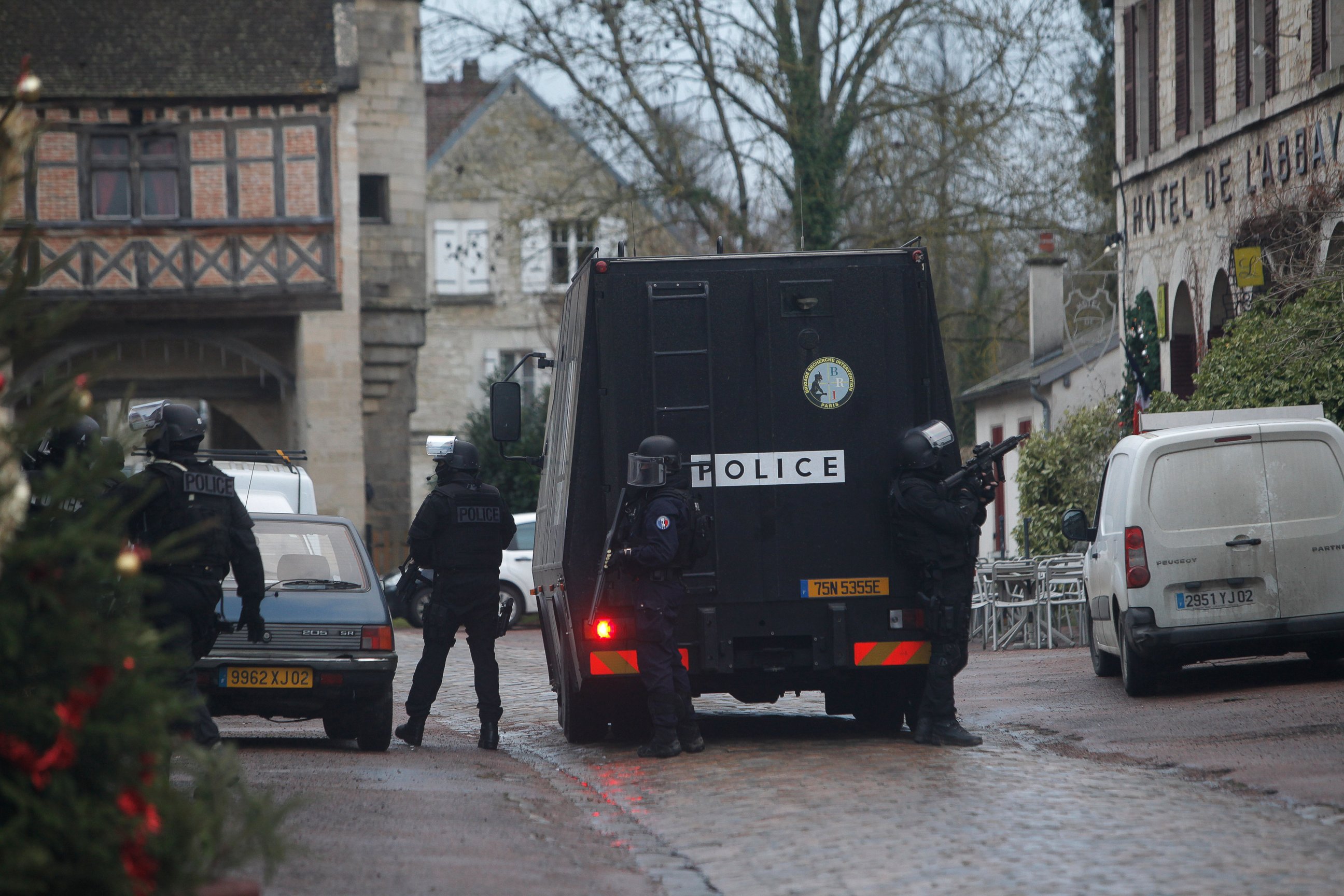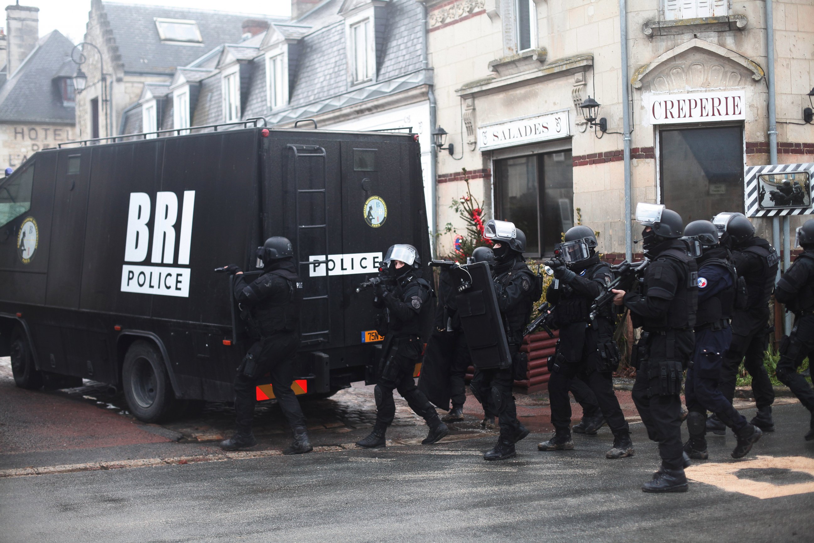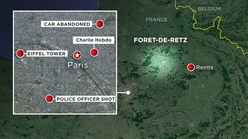 — -- Police in head-to-toe tactical gear and wearing body masks gathered near a forest outside of Paris today as the manhunt continued for the two suspected terrorists who killed a dozen people on Wednesday.