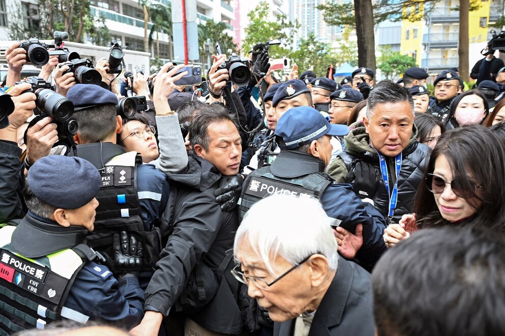 It was a tense morning at the court in Hong Kong. Where there would once be huge lively crowds gathering in support of Hong Kong’s democracy figures, the mood was subdued and yet at the same time on edge. There was a heavy police presence outside the court, where officers were tightly controlling the media and the supporters who were queueing up outside of the court.