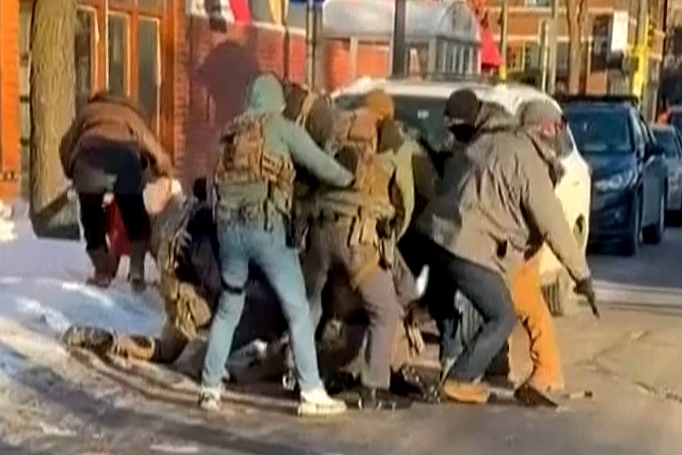 9:01:02 a.m. -- Three officers hold down Pretti, while another group of officers surrounds Pretti. According to ABC News contributor and former acting DHS undersecretary Cohen, the officers do not appear to be following the tactical steps to control and arrest Pretti. “This just seemed to be a free-for-all, and they didn't seem to have any understanding from a tactical perspective on how to gain control of that individual,” he said.