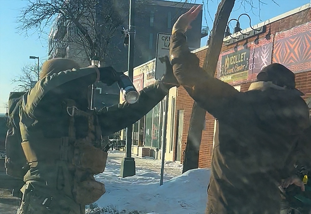 9:00:50 a.m. -- The officer uses pepper spray on Pretti, and Pretti appears to raise his hand towards the officer to get between the officer and the person with the backpack, but the officer immediately pepper-sprays him. According to ABC News contributor and former acting DHS undersecretary Cohen, it appears Pretti used his hand in an attempt to signal that he was not a threat to officers.