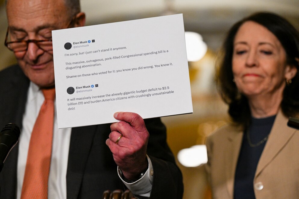 Senate Majority Leader Chuck Schumer held up a printout of the posts during a news conference and said he agreed with the billionaire.