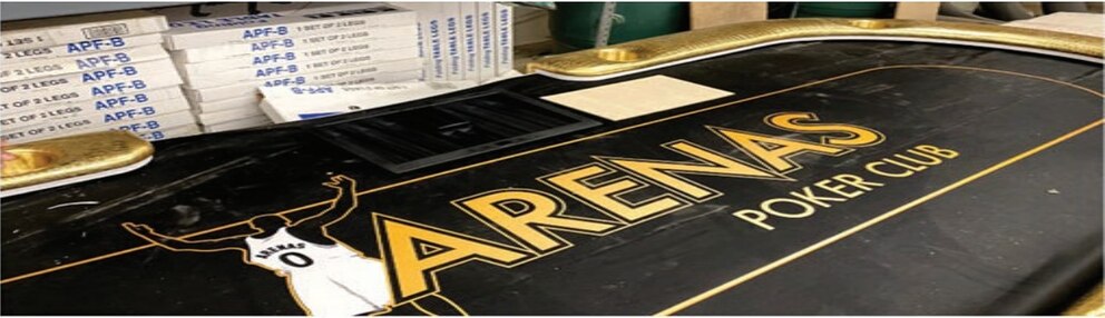 The filing includes a photo of a gold-trimmed poker table with the words "ARENAS POKER CLUB" printed on top along with an image of a basketball player with a jersey labeled "ARENAS."