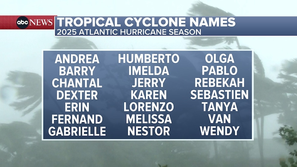 The names for the 2025 season are Andrea, Barry, Chantal, Dexter, Erin, Fernand, Gabrielle, Humberto, Imelda, Jerry, Karen, Lorenzo, Melissa, Nestor, Olga, Pablo, Rebekah, Sebastien, Tanya, Van and Wendy.