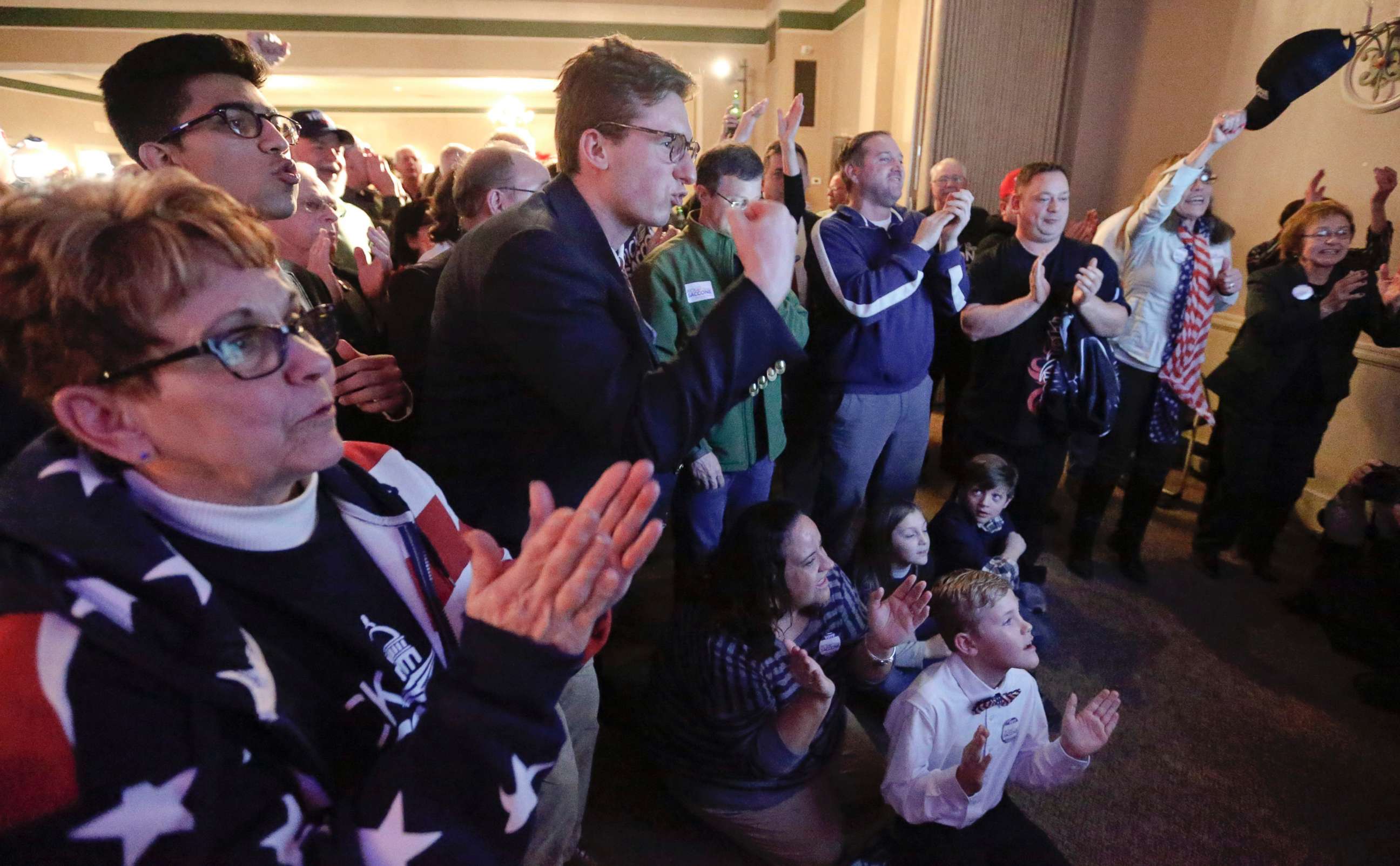 Bobbi Bauer, left, Khalid Husain, top, and Demetrios Germanos, center, celebrate with the crowd as results on the television say Republican Rick Saccone was closing the gap to under 1 percent of the vote March 13, 2018, in McKeesport, Pa.