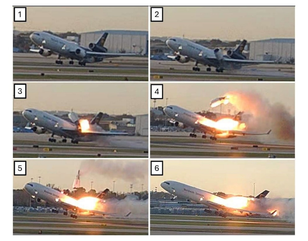 Newly released photos included in a National Transportation Safety Board preliminary report on the deadly UPS plane crash in Louisville show the moment the aircraft's left engine came off during takeoff and ignited.