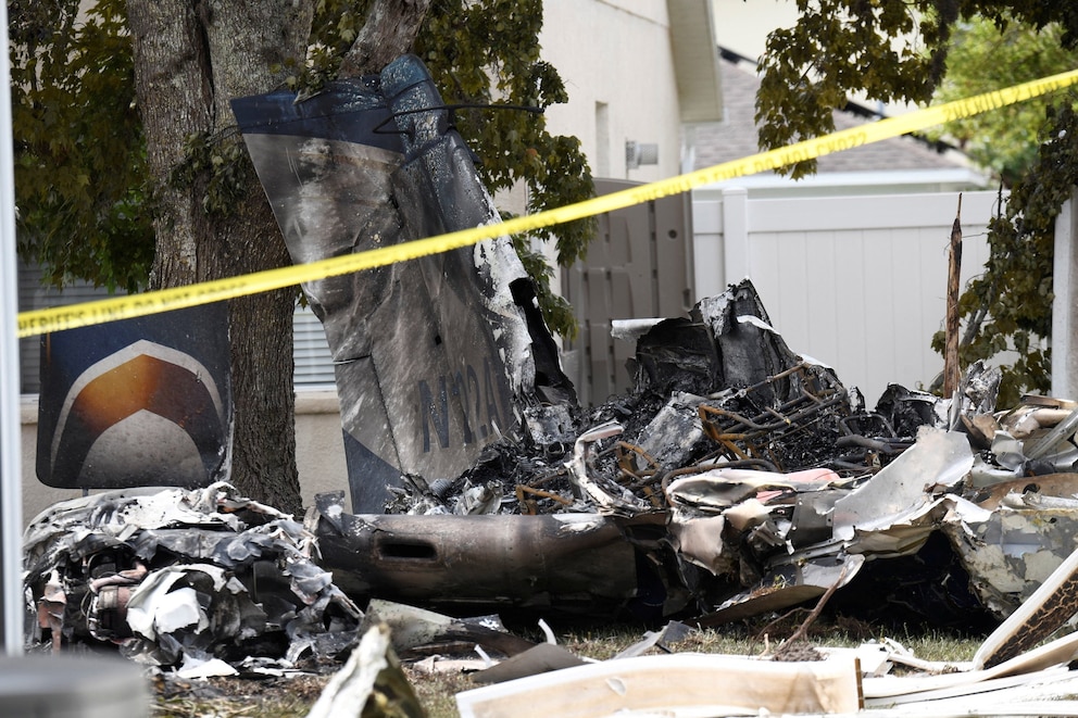 Wreckage from a small plane lies behind homes in the Grand Oaks subdivision after it crashed into residential backyards, in Pasco County, Fla., April 19, 2026.