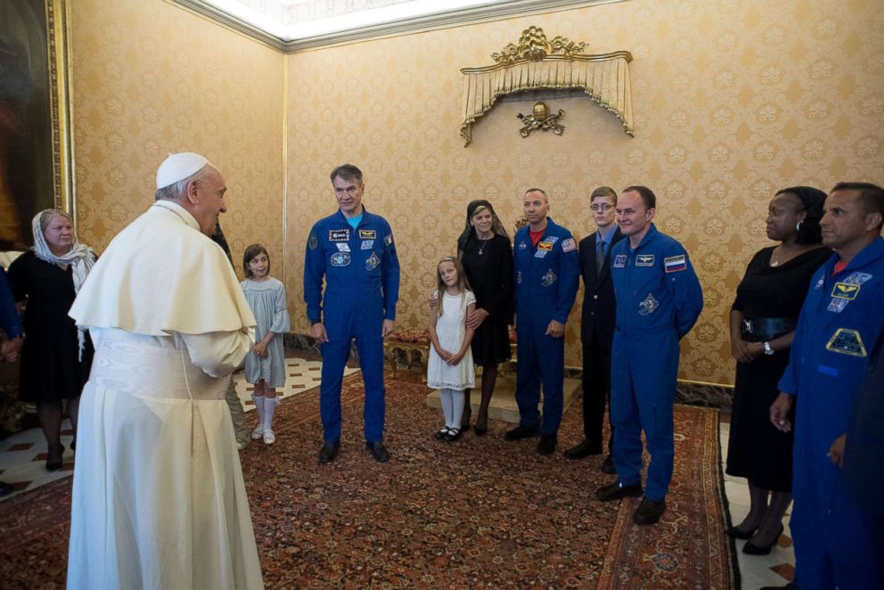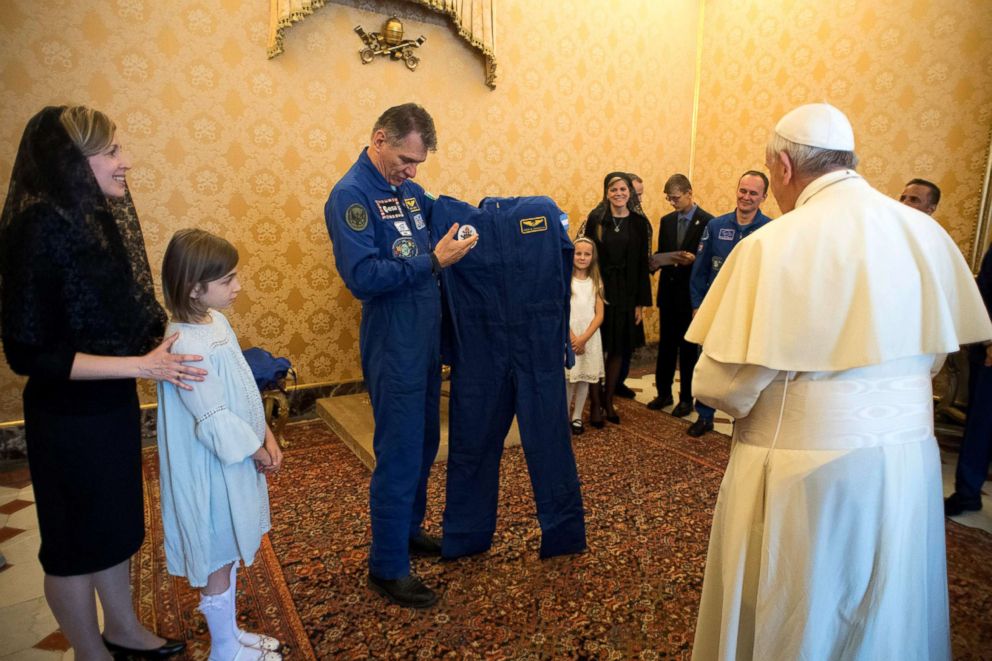 Italian astronaut Paolo Nespoli, along with American Commander Randolph Bresnik, presented Pope Francis on Friday with his very own blue flight suit so he "can go flying." Nespoli and Bresnik were two of five astronauts who, along with their families, were personally invited to meet with the pope at the Vatican.