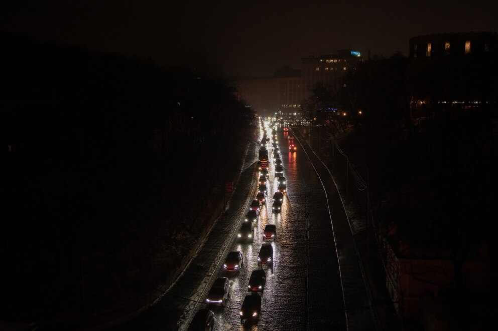 This photograph shows vehicles with headlights driving down a non-illuminated road during a power outage in Kyiv, Ukraine, on Dec. 27, 2025.