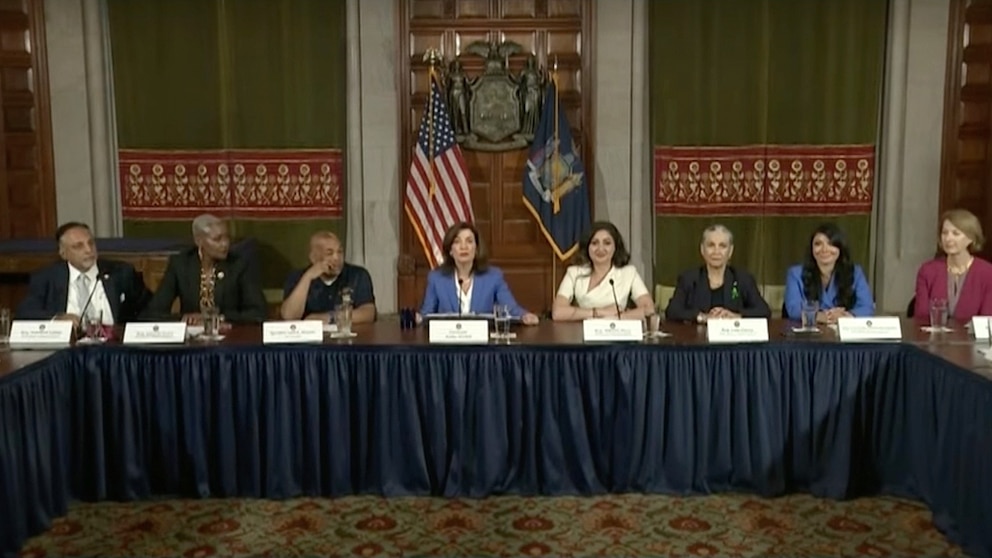 "As I said, history will judge us and how we respond to this moment. But here in New York, we will not stand on the sidelines with the timid souls on the sidelines who don't care and will not invest their heart and soul into this battle. This is a war," Hochul continued. "We are at war and that's why the gloves are off. And I say, bring it on."