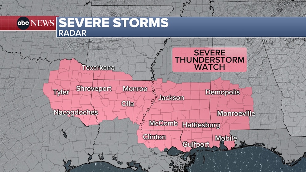 Severe thunderstorm watches are in effect for parts of Texas, Arkansas, Louisiana, Mississippi and Alabama. The main threats are expected to include mostly damaging winds and large hail, but tornadoes can't be ruled out.