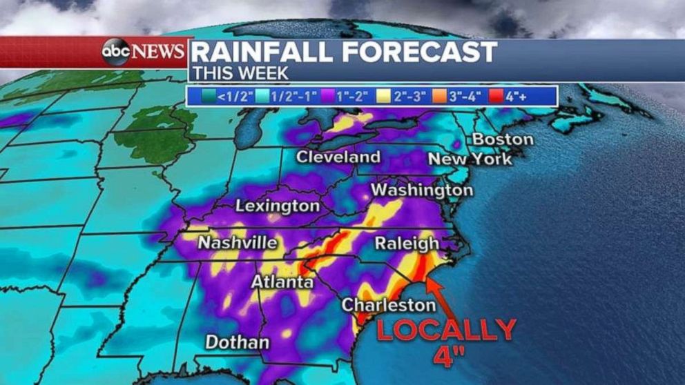 The heaviest rain will fall where flood watches have been issued in the Carolinas and southern mid-Atlantic, where 4 inches locally is possible.
