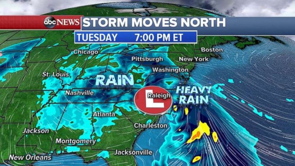 The storm that brought four confirmed tornadoes to the Southeast on Sunday is now moving up the East Coast with a threat for heavy rain and more severe weather, especially in the Carolinas.