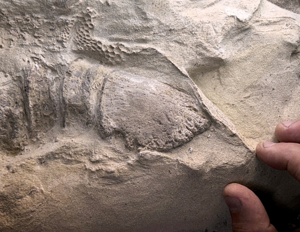 The uniform clay layers are bound by sandstone, rather than true fossilized soft tissue, likely formed as a surface template over the decaying carcass, aided by biofilms.