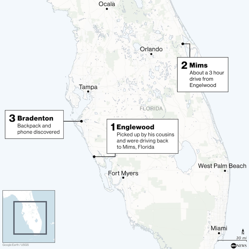 His family said he was "abandoned on the side of the road in Bradenton, Florida," with his backpack and phone discovered in the area by a truck driver the same day he disappeared. Bradenton is about an hour away from Englewood by car.