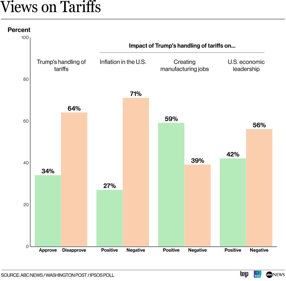 And there is a perceived positive: 59% said they think the tariffs will have a positive impact on creating manufacturing jobs in the United States, including 90% of Republicans and 60% of independents. That, along with bringing prices down, were some of Trump's key campaign promises.