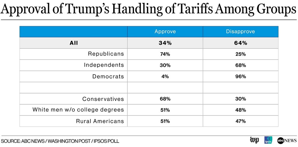 Indeed, in his own party, 25% of Republicans disapprove of Trump's handling of tariffs, as do 30% of conservatives. And disapproval reaches 48% among non-college-educated white men and 47% of rural Americans, two of Trump's core support groups.