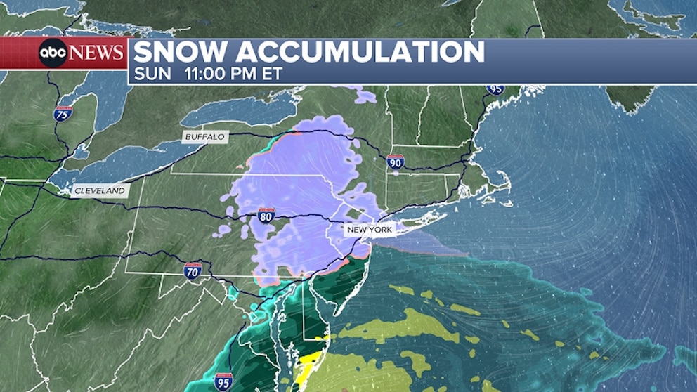Some flurries could begin as early as 7 p.m. ET Sunday in parts of the Northeast and become noticeably heavier around 8 p.m. ET as the system moves into eastern Pennsylvania and southern New York.