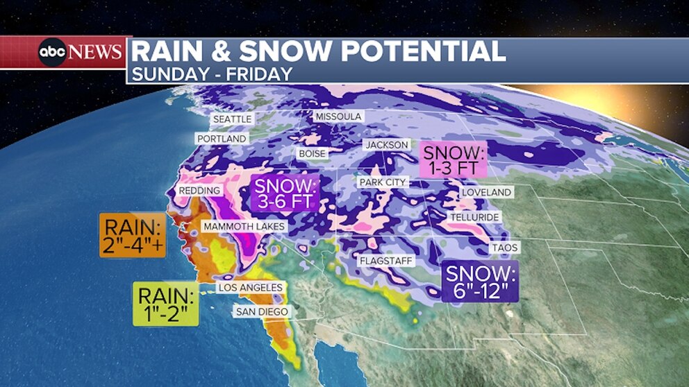 Meanwhile, a series of storms forecast to begin Sunday afternoon will pound the West from California to Colorado with very heavy snow in the mountains and heavy rain and flooding for coastal California.