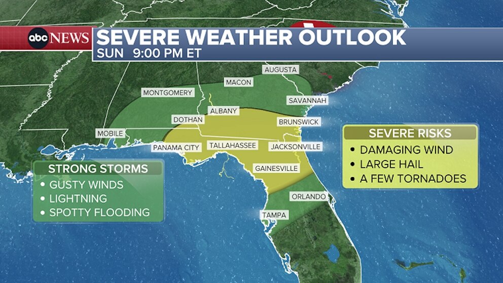 Severe storms are possible on Sunday from Mobile and Montgomery, Alabama, to Macon and Augusta, Georgia. Orlando and Tampa, Florida, are also in the path of the severe weather pattern.