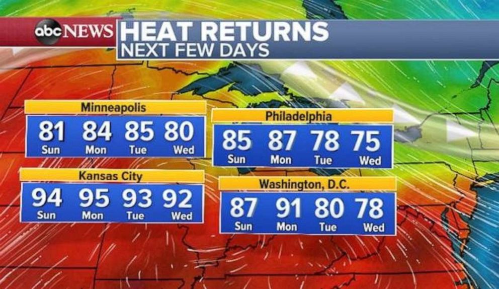 Meanwhile behind this system, warm air will quickly move in with temperatures reaching as high 10 to 15 degrees above average in parts of the Midwest -- most notably Kansas City where temperatures will be in the 90’s through the beginning of the week. Temperatures could come close to 90 degrees from Philadelphia to Washington, D.C. on Monday.