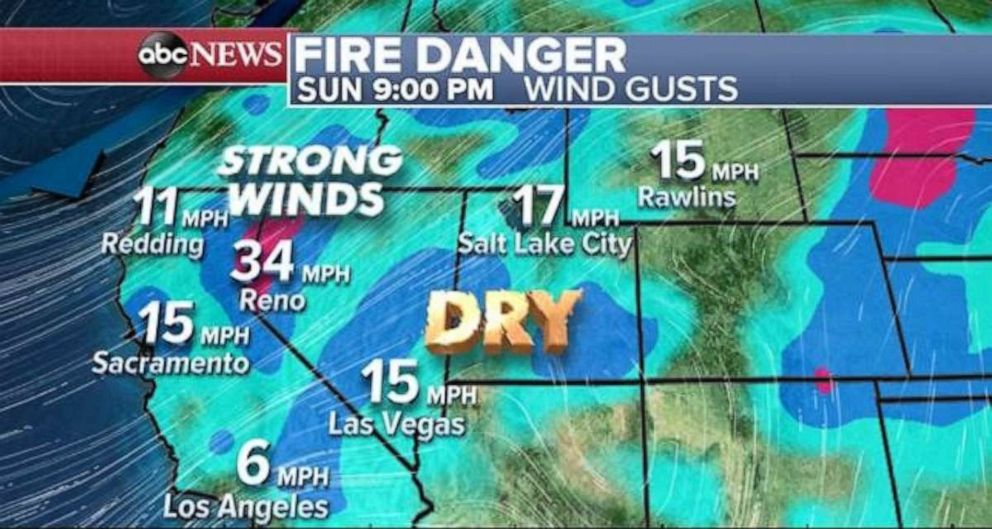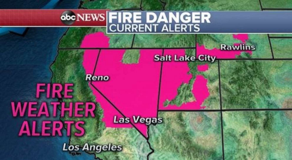 Fire weather watches and Red Flag Warnings have been issued for parts of California eastward to parts of Wyoming. The National weather Service in Reno, Nevada is calling this an Extreme Red Flag Warning and a particularly dangerous situation as wind gusts could reach as high as 60 mph.