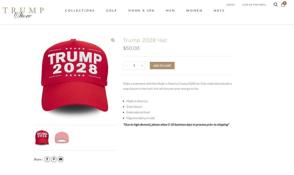 The hat, which appeared on the site on Thursday, is being sold for $50, and the website adds that the hats are "Made in America."