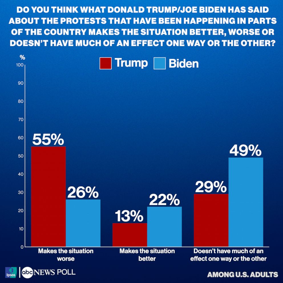 Over half of the country -- 55% -- in the new poll, which was conducted by Ipsos in partnership with ABC News using Ipsos' Knowledge Panel, said they think Trump is aggravating the situation, while just over one in 10 Americans, 13%, said they think he is making it better. Fewer than one-third, 29%, believe what Trump has said on the topic has had no effect on the protests over racial injustice.